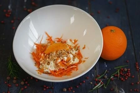 Состав: Морковь, сметана, апельсин, грецкий орех, сахарная пудра, зелень